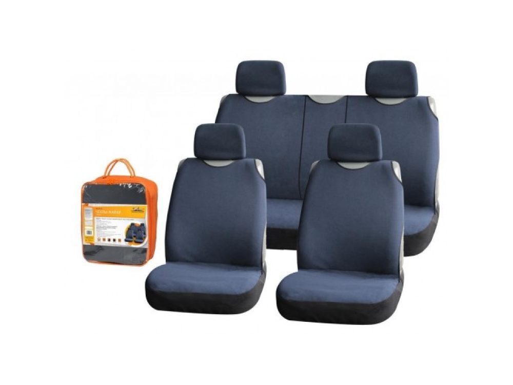 В комплекте представлены чехлы для передних и задних автомобильных сидений. Форма майки позволяет закрыть всю поверхность обшивки сидений салона, предохраняя ее от отрицательного постороннего воздействия. Темно-синий цвет чехлов делает их легко чистящимися, а полиэстер, из которого сшиты изделия, позволяет надолго сохранять их изначальный вид.