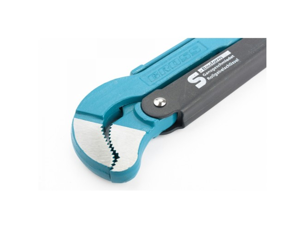 Ключ трубный рычажный типа S усиленной конструкции, применяется при повышенных нагрузках. Предназначен для захватывания и вращения труб и соединительных частей трубопроводов. Изготовлен из высококачественной хромванадиевой стали. Имеет порошковое антикоррозийное покрытие. Губки дополнительно закалены токами высокой частоты до твердости 57–60 HRс. Прогрессивная форма зуба с наклоном против направления вращения обеспечивает самоблокируемый захват деталей. Верхняя ручка имеет выштампованный Т-образный профиль. Регулировочная гайка снабжена стопорным кольцом.